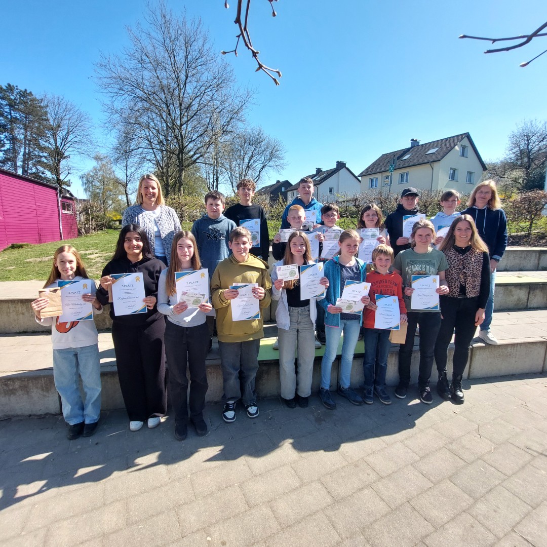 Foto (Christian Landerbarthold): Stolz präsentieren die Gewinner der fünften bis neunten Klassen ihre Urkunden und Gewinne, die sie von den Pädagogen Christina Schlüpmann, Julia Kallaß und Kerstin Trägenap-Zunkel (von links) erhalten haben. Den ersten Platz belegten: Laureen Dietz und Luca Iren (Jahrgang 5), Tyler Penner (Jahrgang 6), Annemarie Trinczek (Jahrgang 7), Lara Trinczek (Jahrgang 8) und Carl Mohrenstecher und Elias Willms (Jahrgang 9).