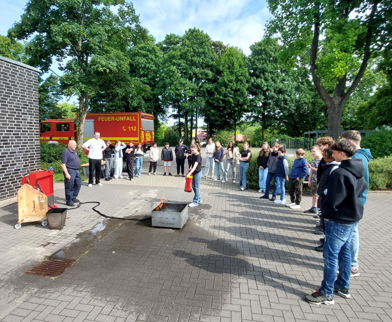 Foto (Christian Landerbarthold): Die praktische Anwendung eines Feuerlöschers übten die Schülerinnen und Schüler der Klasse 7c jetzt im Rahmen der Brandschutzerziehung unter fachkundiger Anleitung von Feuerwehrmann Klaus Sieveke.