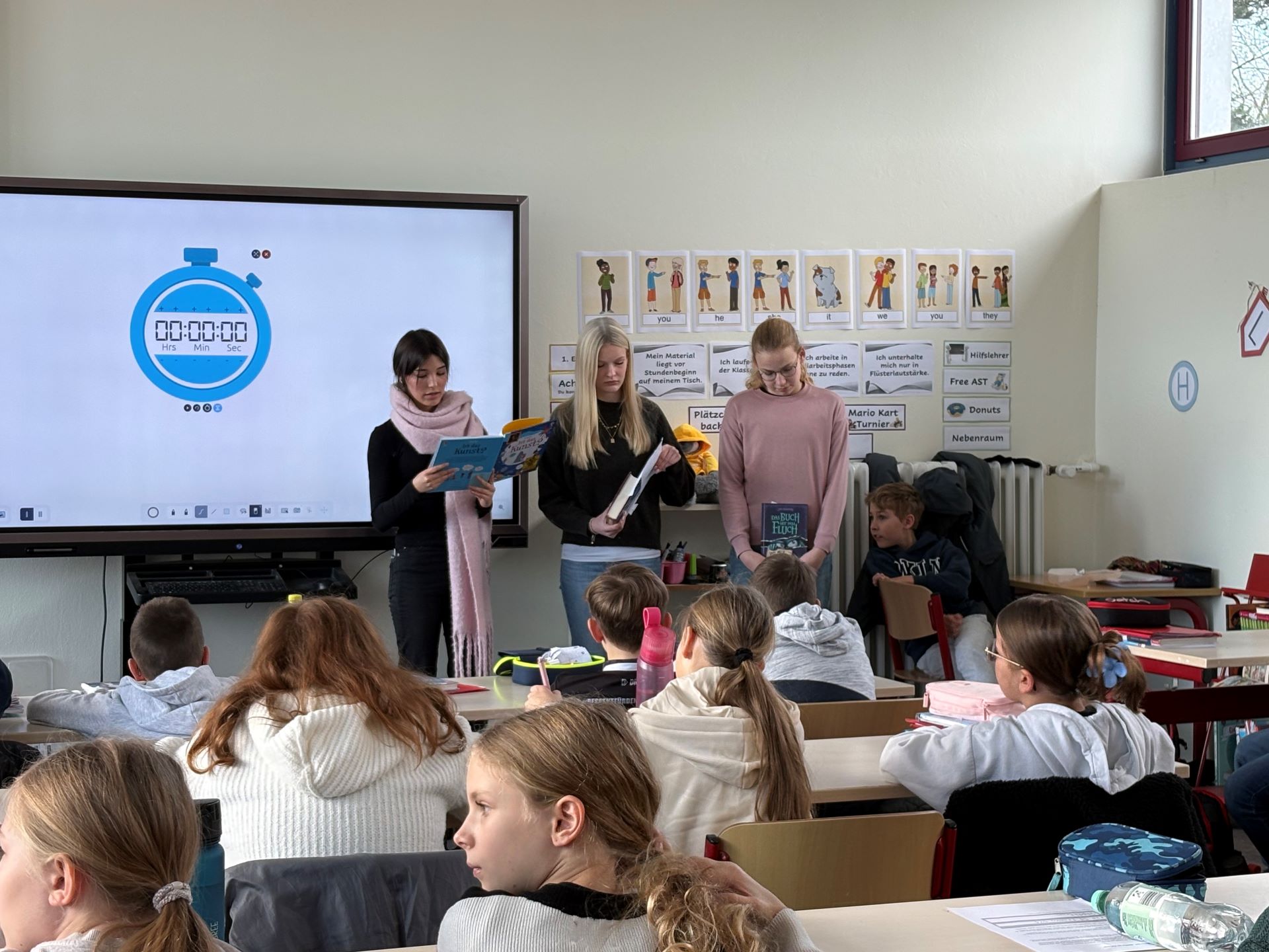 Auch der Deutsch-Fachleistungskurs von Lehrer Marco Weigmann war in Sachen Vorlesen unterwegs. Trotz krankheitsbedingter Ausfälle besuchten einige NeuntklässlerInnen und Neuntklässler den Grundschulverbund Oerlinghausen und präsentierten in den ersten und zweiten Klassen das Buch „Tafiti und die Reise ans Ende der Welt“. Alleine oder im Zweierteam lasen sie mit großem Engagement vor, beantworteten Fragen der Grundschulkinder und ließen die Abenteuer von Tafiti lebendig werden. „Der Besuch war für beide Seiten ein voller Erfolg und zeigt deutlich, wie viel Freude gemeinsames Lesen bereiten kann“, betonte Weigmann. Für das kommende Jahr steht bereits fest: Der Deutschkurs möchte unbedingt wiederkommen.